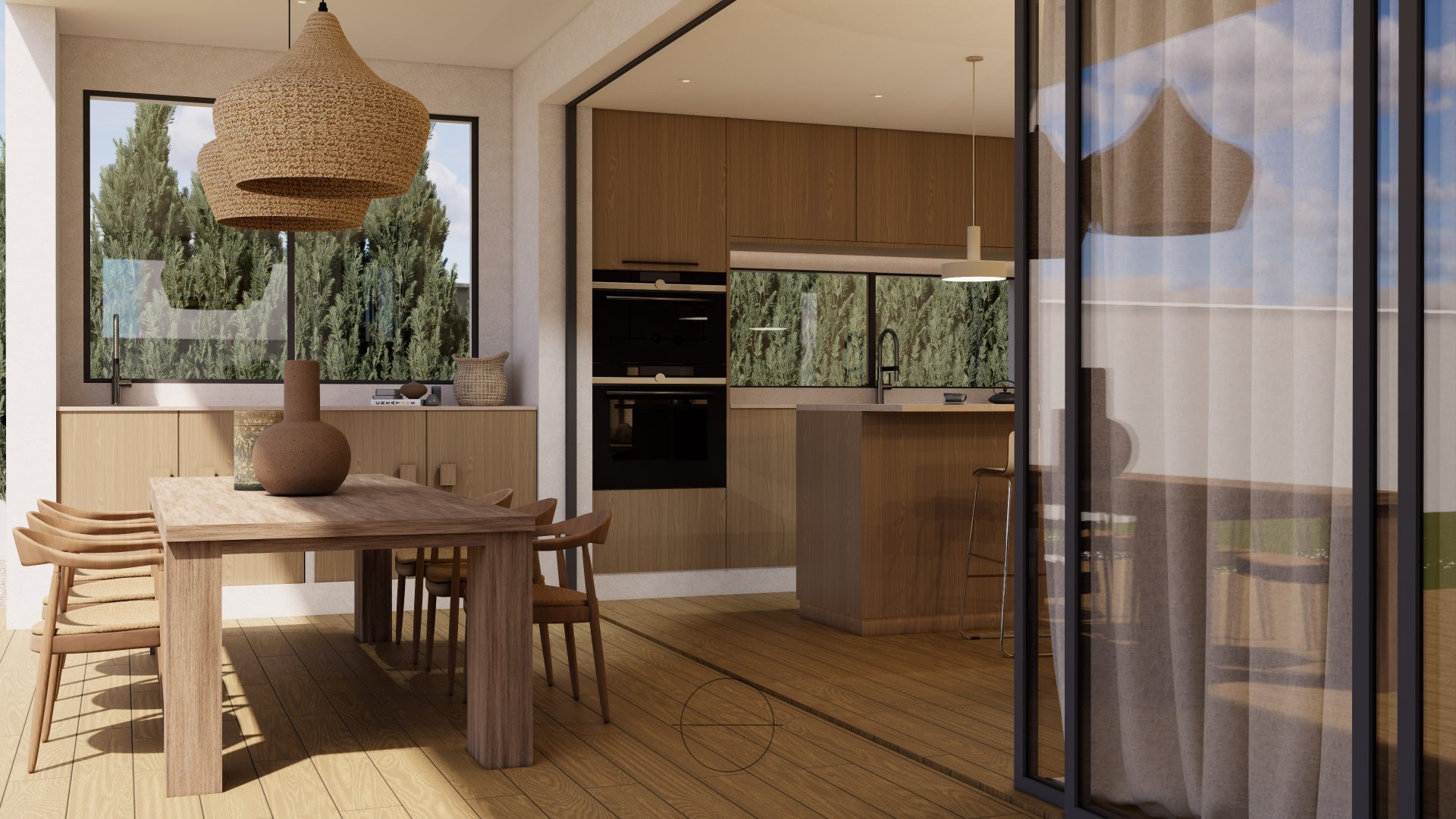 Se caracteriza por su diseño contemporáneo y funcional, volumétricamente se compone por dos volúmenes longitudinales que conforman zona diurna y zona privada , en planta primera se cosen esos dos volúmenes con una única pieza transversal. Esta disposición no solo optimiza la circulación y la privacidad, sino que también crea una conexión fluida entre los diferentes ambientes de la casa.