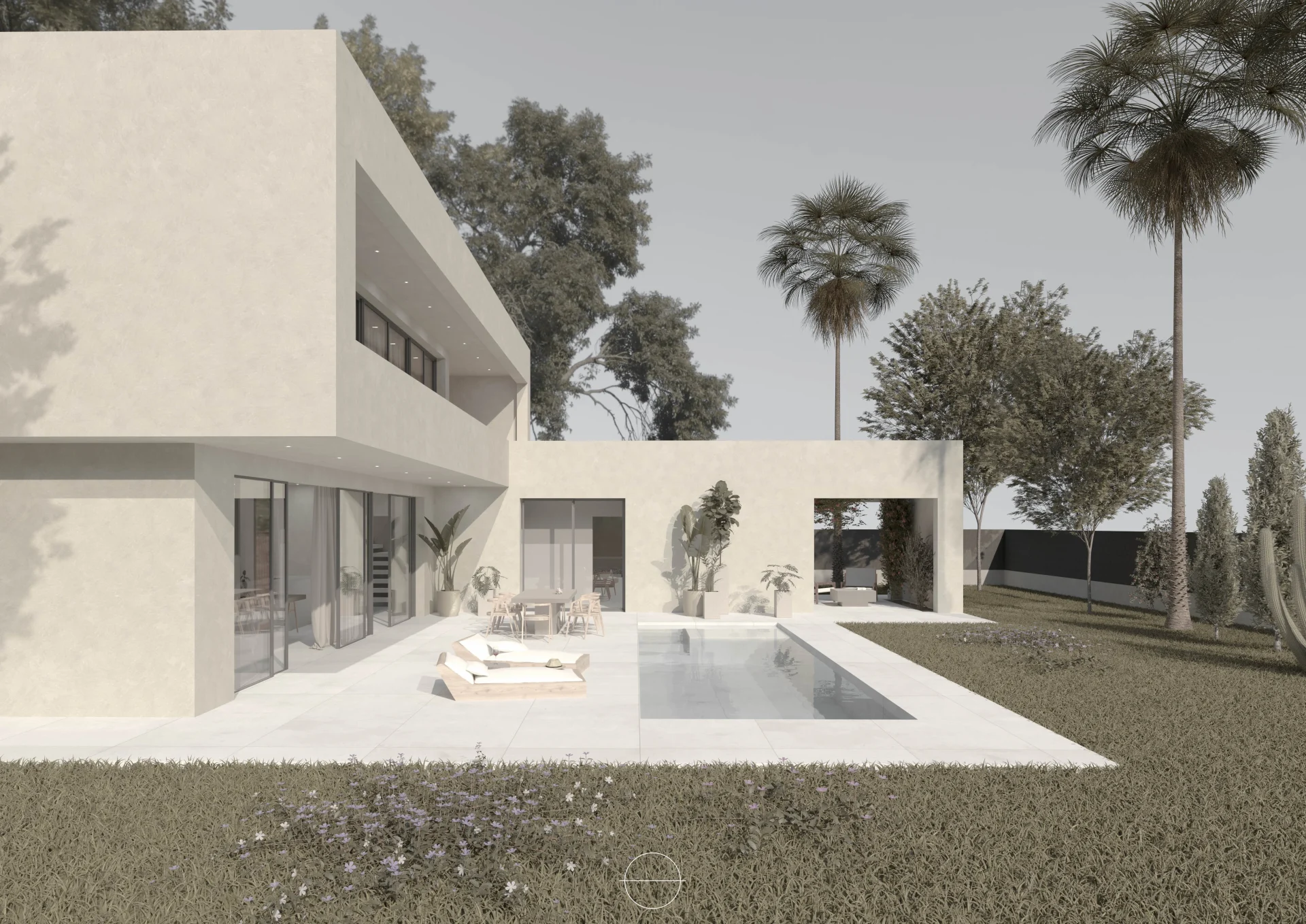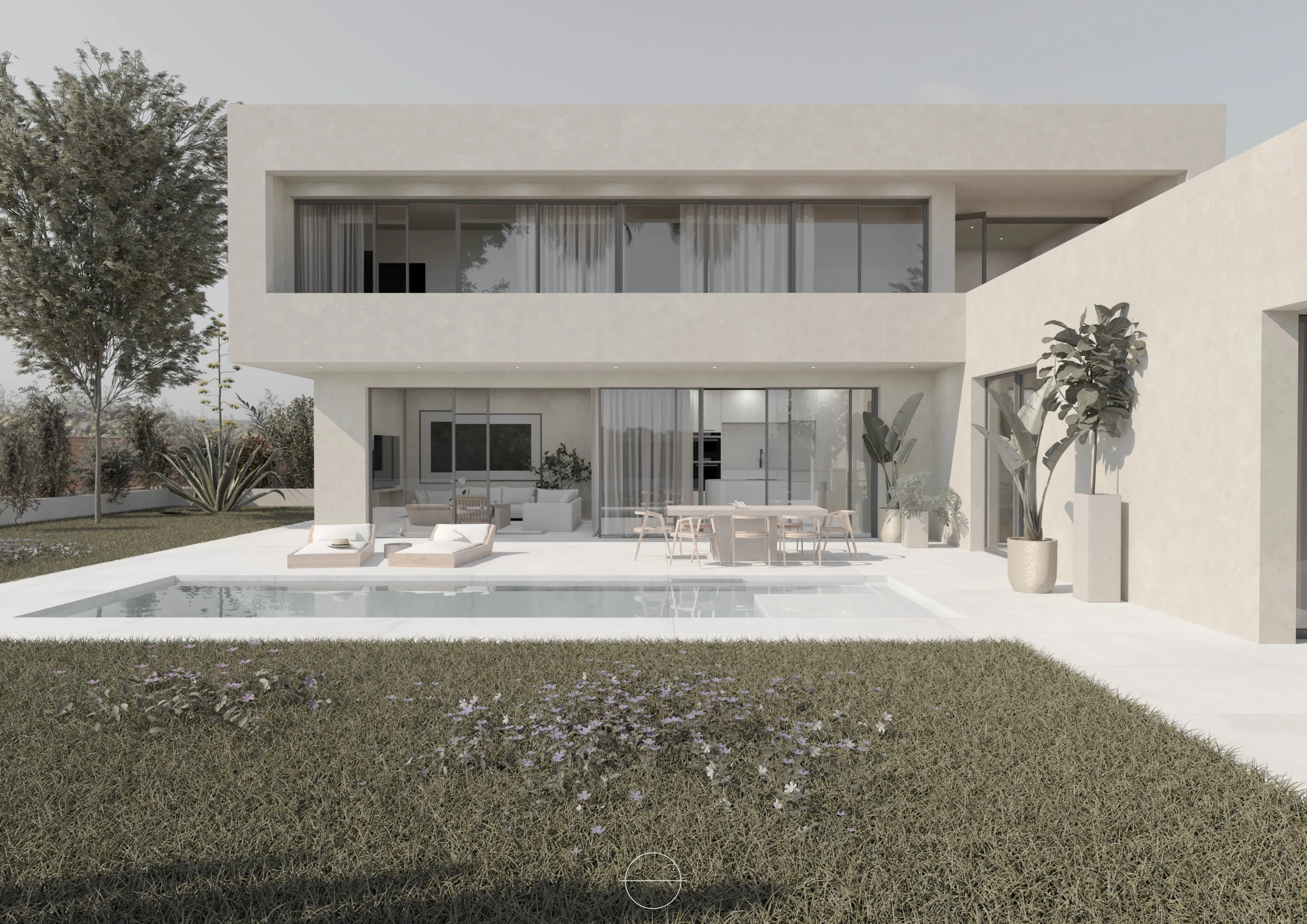 La Casa L se distingue por su línea moderna y sus volúmenes limpios y blancos, que se combinan armoniosamente con el uso de materiales naturales, como el mortero de cal. Esta elección de materiales no solo aporta calidez y textura al diseño, sino que también refleja un compromiso con la sostenibilidad y la integración en el entorno.