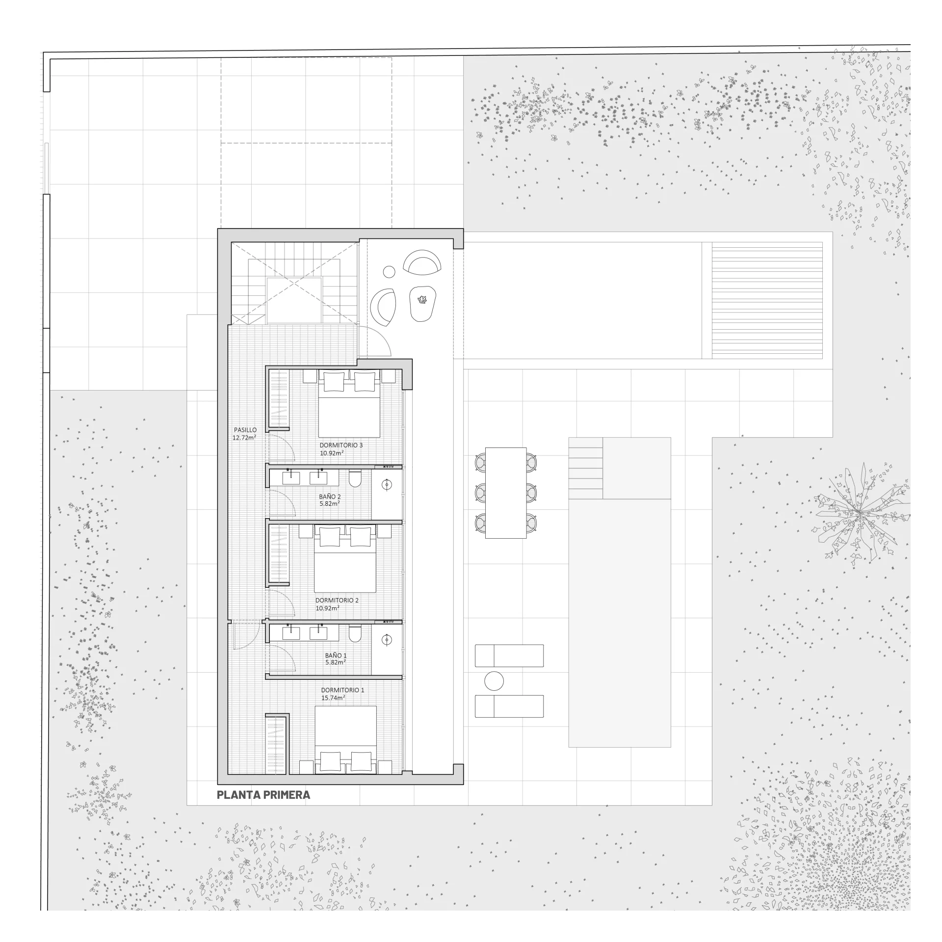 El volumen perpendicular alberga el área privada de la vivienda, que incluye un dormitorio doble con baño en suite y una terraza privada, ideal para momentos de relajación. En la planta superior, se disponen tres dormitorios dobles, cada uno con acceso a una terraza. Uno de estos dormitorios cuenta con un baño privado, mientras que los otros dos comparten un baño, optimizando así el uso del espacio.